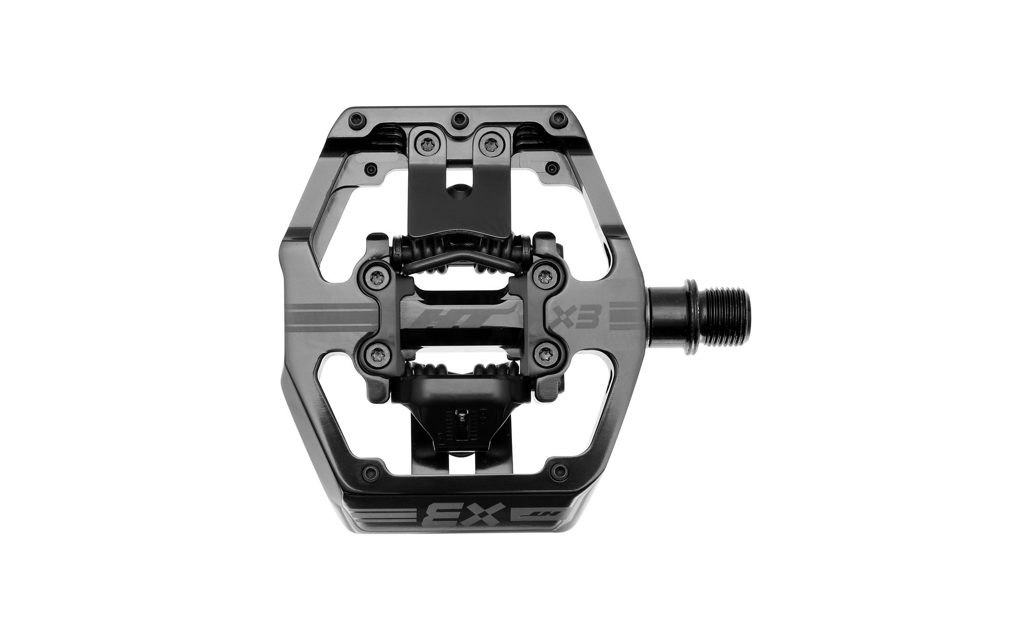 DH / FR nášlapné pedále s platformou z hliníku; Telo: CNC 6861 Alu; Oska z CNC CrMo; Zapúzdrené ložiská / IGUS púzdra; Kufre: X1F / kompatibilné s X1; Nový dizajn oporných dosiek kufrov; Konvexný tvar tela pedálu; Vymeniteľné SP7 piny - 5 z každej strany; Váha: 476g; Rozmer: 85 x 94 x 14 mm; Farba: stealth čierna